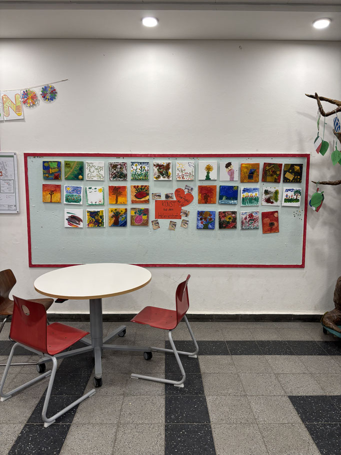 Ein ganz besonderes Dankeschön geht an das Seniorenheim Helenenhof: Die Bewohnerinnen und Bewohner haben gemeinsam mit Tatjana vom Kinderschutzbund viele farbenfrohe Bilder gemalt – und diese dürfen nun für einige Wochen bei uns in der Schule ausgestellt werden.