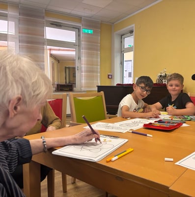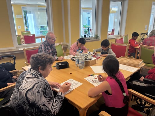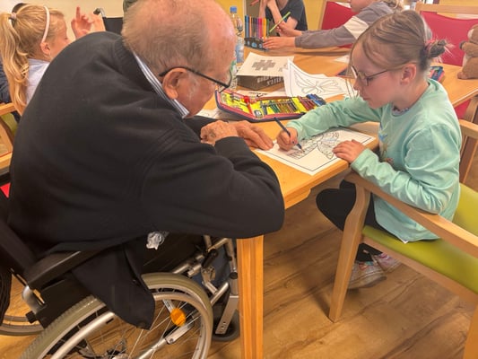 Zusammen mit den Bewohnerinnen und Bewohnern wurde fleißig gemalt, gesungen und gequasselt. Die Kinder hörten gespannt zu, stellten Fragen und ließen sich auch selbst einiges erzählen. Zum Abschluss gab es für alle noch leckeren Saft und Kakao. Dabei entstanden schöne Begegnungen zwischen Jung und Alt, die allen ein Lächeln ins Gesicht zauberten.